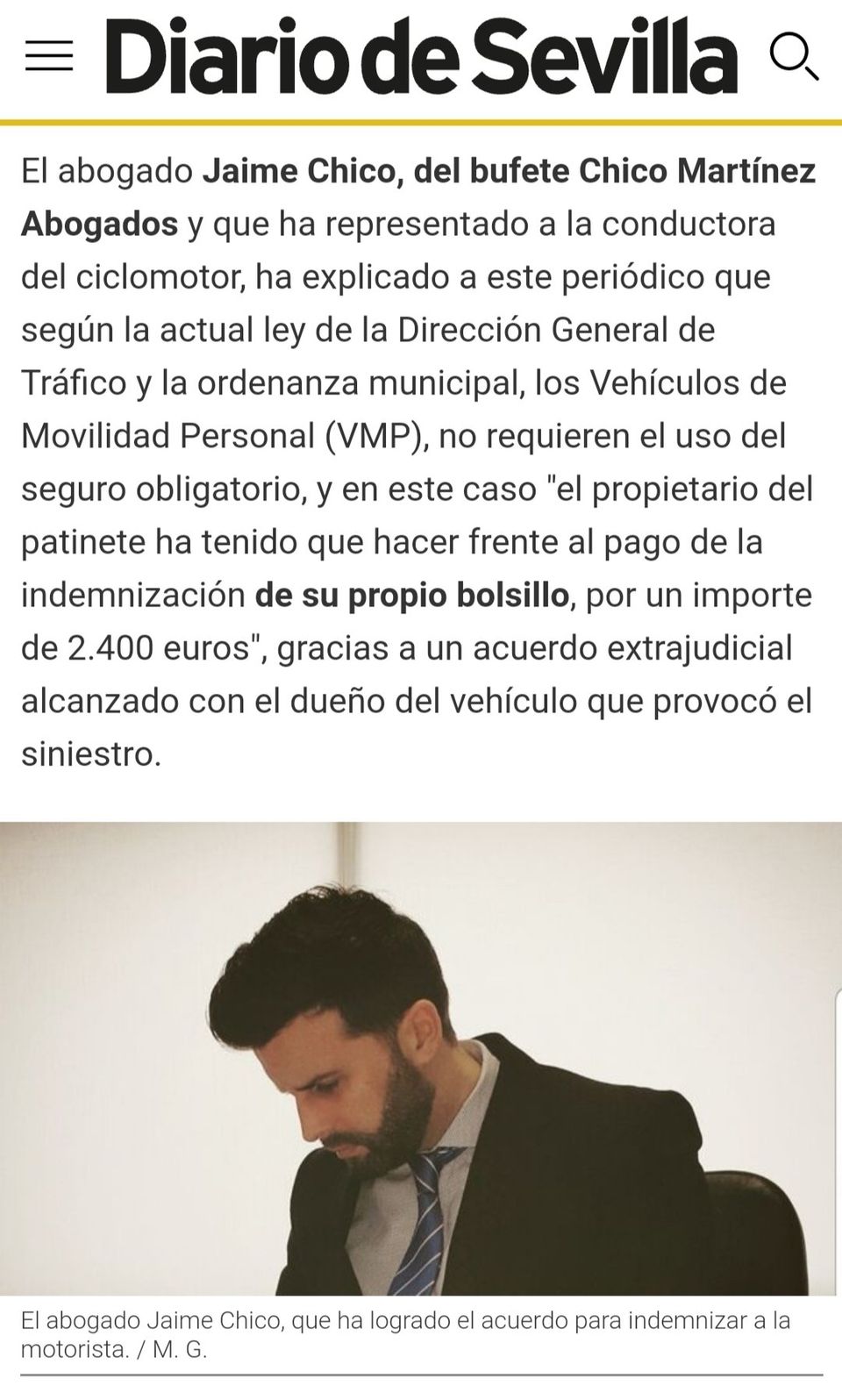 El abogado Jaime Chico, del bufete Chico Martínez Abogados y que ha representado a la conductora del ciclomotor, ha explicado a este periódico que según la actual ley de la Dirección General de Tráfico y la ordenanza municipal, los Vehículos de Movilidad Personal (VMP), no requieren el uso del seguro obligatorio, y en este caso "el propietario del patinete ha tenido que hacer frente al pago de la indemnización de su propio bolsillo, por un importe de 2.400 euros", gracias a un acuerdo extrajudicial alcanzado con el dueño del vehículo que provocó el siniestro.